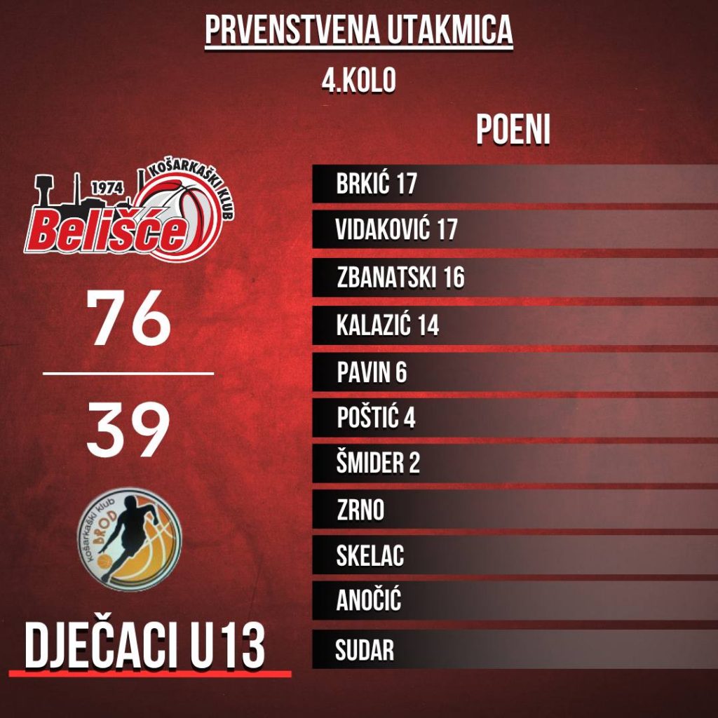 Jedini koji su igrali ovaj vikend su Dječaci U13, koji su ugostili ekipu Broda u sklopu 4. kola. Nakon što im je prošli vikend odgođena utakmica 3.kola, naši su igrači jedva dočekali novu utakmicu, iako početak to i nije otkrivao. Nevjerojatno loše otvaranje utakmice i samo dva poena (2:6) za šest minuta, natjerali su trenera Gorana Vidakovića na time-out, na kojem je, kasnije se pokazalo, dobrano razbudio svoje pulene, koji su ostavili goste u narednih 7-8 minuta bez poena. Serijom 13:0 prvo su došli do 15:6 za kraj prve četvrtine, a onda je razlika išla sve do 26:6, kada su gosti postigli svoje slijedeće poene. Na poluvrijeme se otišlo sa rezultatom 37:10 u korist naše ekipe. Presing i agresvina igra u napadu te puno čvršća obrana donijeli su veliki broj lakih poena, na kraju i stečenu visoku razliku.