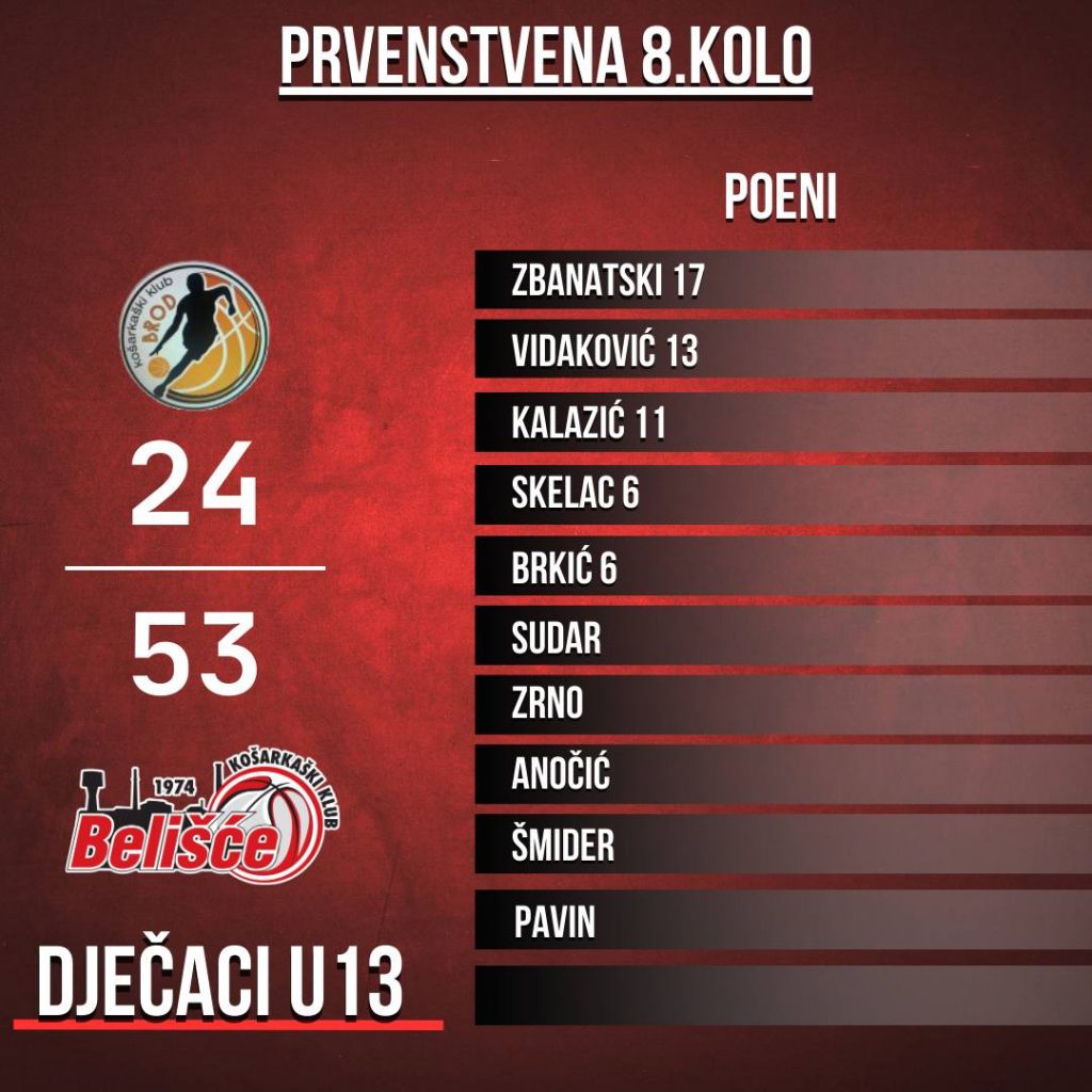 U13 ekipa je u subotu odigrala posljednju utakmicu u svojoj skupini i sa visokih 24:53 slavila na gostovanju kod drugoplasirane ekipe KK Brod. Naši su dečki od početka utakmice nametnuli svoj ritam, pogotovo u obrani, gdje su u prvom poluvremenu domaćinu dozvolili svega 12 poena, a pitanje pobjednika bilo je definitivno riješeno već nakon nekoliko minuta drugog poluvremena kada je naša ekipa otišla na nedostižnih 20-tak razlike pa je trener Goran Vidaković iskoristio priliku te svim igračima raspodijelio minutažu.