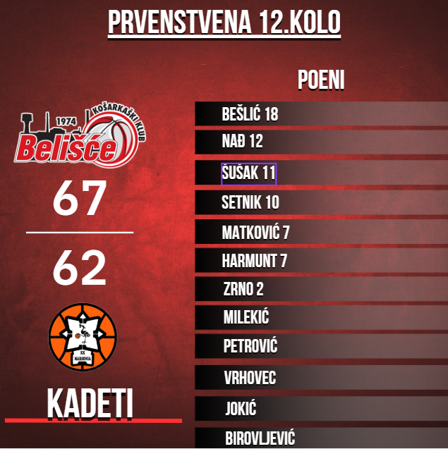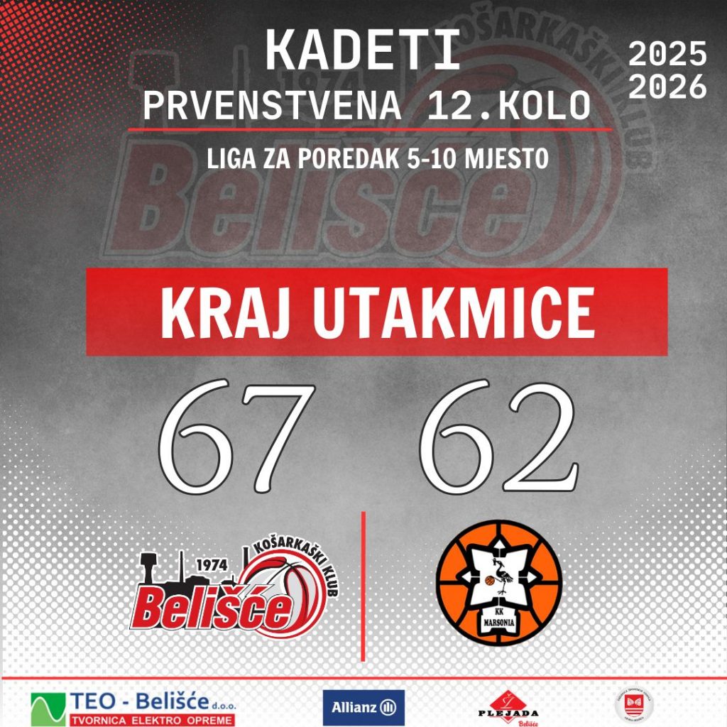 Momčad Maria Koprivnjaka, naši kadeti, su u drugoj utakmici drugog dijela sezone na svom parketu bili bolji od Marsonije. Odlično su naši dečki ušli u utakmicu, imali visokih 30:8 nakon prvih deset minuta, a onda malo popustili u drugoj četvrtini. Kako to i biva, gosti su se vratili u život, dobili drugih deset minuta 13:24 i utakmica je otišla u neizvjesne vode.